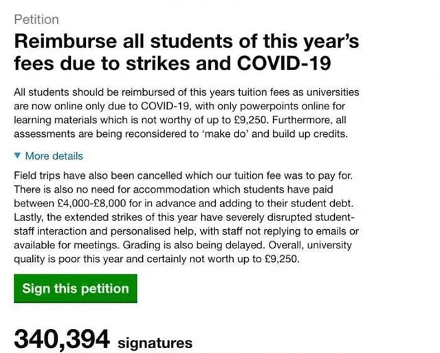 由于疫情迫使很多英國學校關(guān)閉,學生無法使用圖書館等設(shè)施,課程也都改成網(wǎng)課,留學生認為自己支付的高昂學費“打水漂”了,因此在英國議會網(wǎng)站發(fā)起聯(lián)名請愿,要求英國大學退還2019/2020學年的整年學費和住宿費,目前已有超過34萬名學生加入了該請愿。