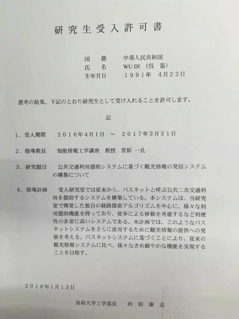 恭喜本校吳迪同學(xué)日本國立大學(xué)研究生合格