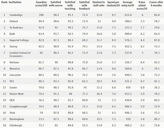 英國(guó)《衛(wèi)報(bào)》2014年6月2日發(fā)布的2015年英國(guó)大學(xué)排名新鮮出爐了!劍橋大學(xué)連續(xù)四年蟬聯(lián)第一,牛津大學(xué)依然第二,而令人意外的是,圣安德魯斯大學(xué)成了今年的探花,巴斯大學(xué)升至第四,去年的老三倫敦政治經(jīng)濟(jì)學(xué)院卻降到了第7。下面一起來(lái)看一下2015衛(wèi)報(bào)英國(guó)大學(xué)排名情況。